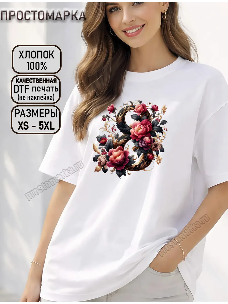 Подарите себе или своим близким настоящий праздник с нашей новой женской футболкой, созданной специально к 8 марта! Эта базовая футболка из 100% хлопка станет идеальным подарком для любой женщины, ценящей комфорт и стиль. Ее свободный крой и удлиненная длина обеспечат максимальное удобство, а мягкий, дышащий материал подарит ощущение легкости и свежести в течение всего дня. Наши футболки выполнены из высококачественного хлопка плотностью 160 г/кв.м., что гарантирует их долговечность и приятные тактильные ощущения. Яркий принт с пионами и надписью "8 марта" создан с помощью технологии DTF печати, которая обеспечивает яркость и стойкость изображения даже после многочисленных стирок. Эта футболка станет прекрасным дополнением к любому образу, будь то повседневный или праздничный. Отличная альтернатива стандартным подаркам, она подчеркнет индивидуальность и подарит заряд позитива!