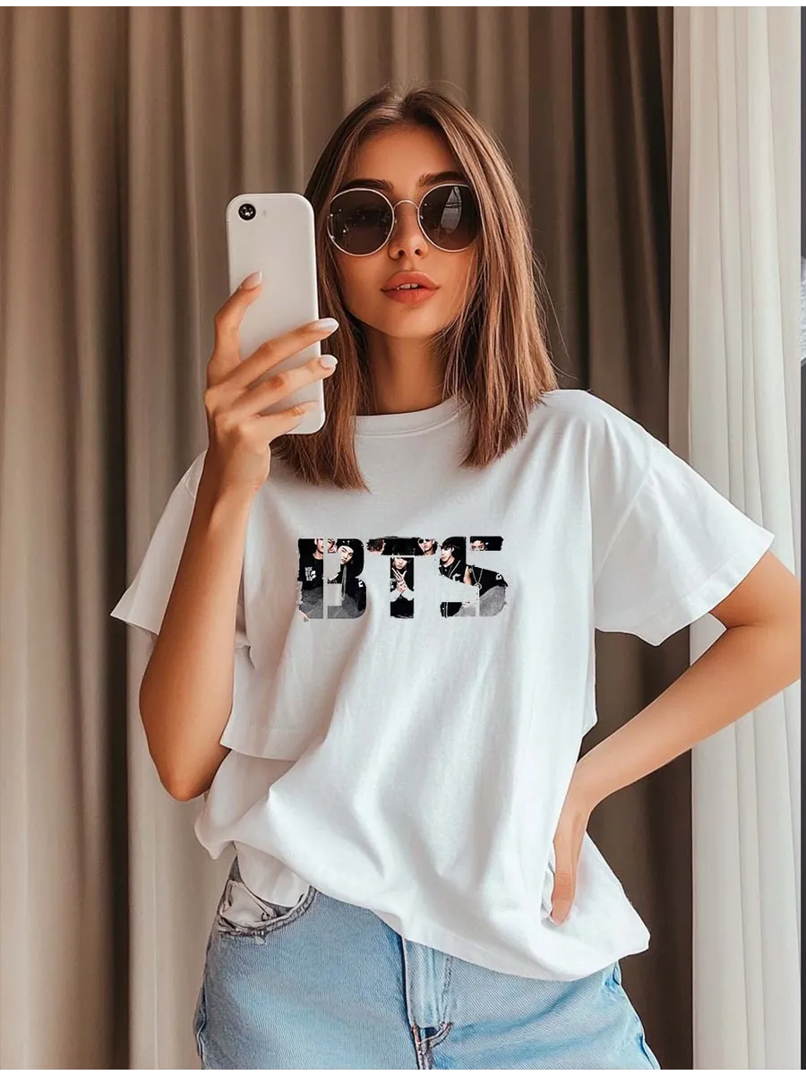Женская футболка с принтом BTS.Отличное решение для подарка себе и близким.Ткань футболки-100% Хлопок, что гарантируетВам комфортное использование на протяжении долгого времени.Мягкий натуральный хлопок гипоаллергенен, не раздражает кожу и позволяет ей дышать.Супер легкая, приятная телу ткань легко гладится.