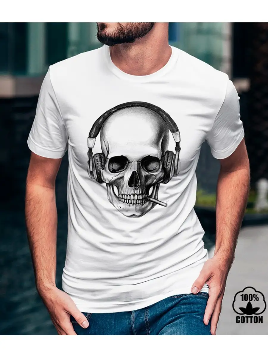 Мужская футболка с дизайнерским принтом (Череп в наушниках) Округлый вырез горловины. Нанесение принта очень качественное и на ощупь не чувствуется. Футболка после стирки не садится. Рекомендуется стирать при температуре не выше 40 градусов,Супер легкая, приятная телу ткань, легко гладится.