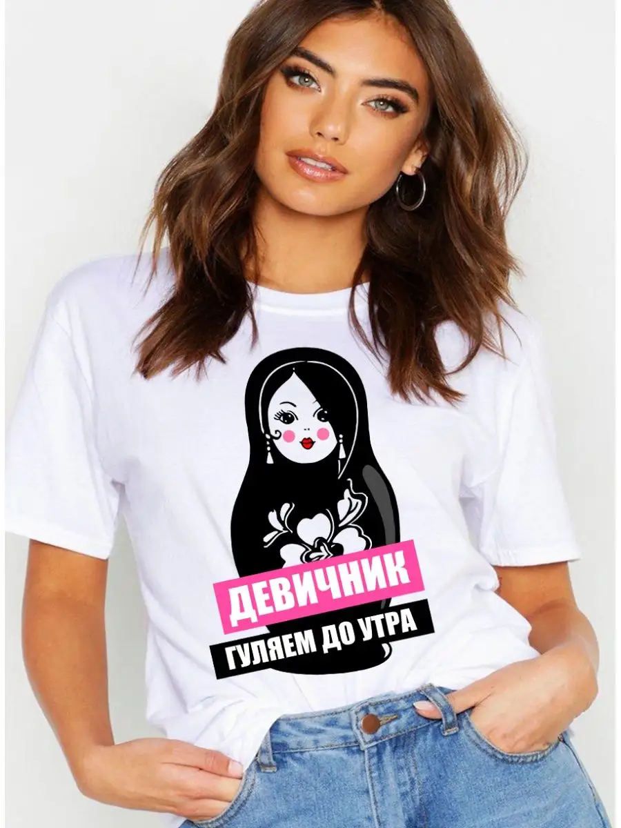 "Футболка для невесты: стильный акцент на свадебной церемонии! На девичник, банда невесты, счастливая невеста, подружка невесты, с надписью невеста. Наша футболка для невесты – это необычное сочетание стиля и оригинальности, чтобы выделиться на фоне ожесточенной борьбы за главный приз в чьей-то жизни – свадьбе! Главным образом футболка для невесты представлена в традиционном классическом белом цвете, чтобы подчеркнуть вашу нежность и неповторимость. Однако, наш дизайнер добавил небольшую изюминку, чтобы надолго запомнить этот праздник – уникальный принт, мотивом которого является знакомая каждому с детства матрешка. Будьте уверены, что эта футболка привлечет внимание всех, кто окажется поблизости. Невеста – понятие, которым каждый ассоциирует великолепие, романтику и загадочность.Каждый должен знать, что вы – невеста, и эта футболка поможет вам об этом напомнить. Не упустите возможность создать ошеломляющий образ в такой особенный момент. Для вашего комфорта и наиболее подходящего размера мы предлагаем множество доступных вариантов, которые позволят вам найти свой идеальный размер. Закажите сейчас футболку для невесты и погрузитесь в мир неповторимости и оригинальности вместе с нами!" Классическая белая футболка свободного кроя с принтом Невеста и подружки невесты станет отличным вариантом для нарядов на девичник поможет добавить вашему празднику изюминки и веселья! Футболки для девичника выполнены из хлопка. Сделайте Ваш девичник еще более привлекательным все оценят и получатся отличные фото на память! Для каждой подружки можно выбрать свою надпись Женские Футболки Oversize с яркими принтами - отличный вариант для фотосессии и незабываемого праздника. Футболка универсальна и применима как спортивная для бега и фитнеса домашняя, повседневная одежда, большие размеры, женская одежда для сна для офиса для работы для прогулок для встреч с друзьями, для свиданий, для подружек невесты. Женская футболка - это отличный подарок для подруги для мамы для сестры.
