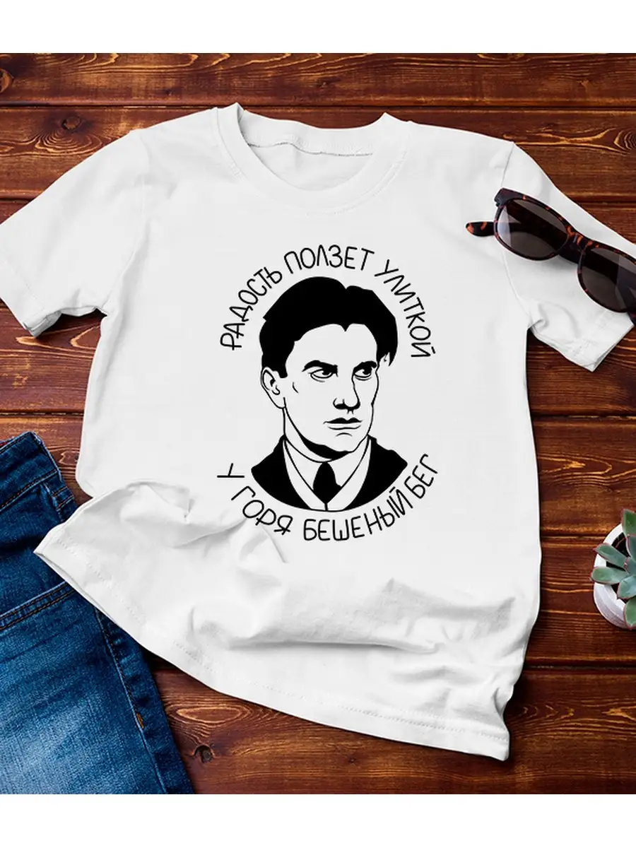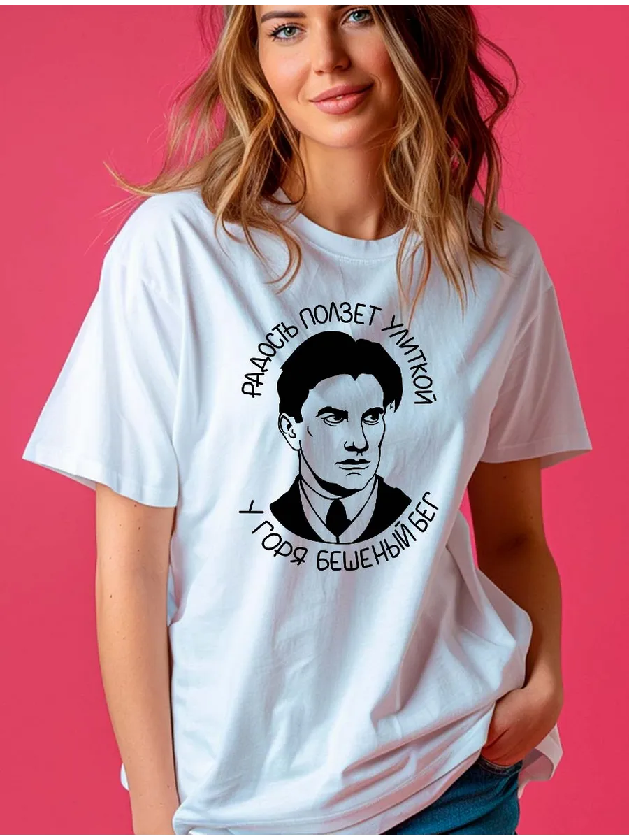 В нашей коллекции представлены футболки с писателями и поэтами, футболка с принтом Владимир Маяковский, Александр Сергеевич Пушкин, Лев Толстой и многие другие. Отличное решение для подарка себе и близким. Ткань плотная, приятная к телу,хлопок 100% Крой футболки-свободный,модный,легкий оверсайз-очень модно и стильно. Футболку такого кроя можно носить с любой одеждой-джинсами,юбкой,костюмом.Оригинальный принт выделит Вас среди других девушек. Отличный подарок на день учителя, новый год, 8 марта или просто без повода любимому учителю.