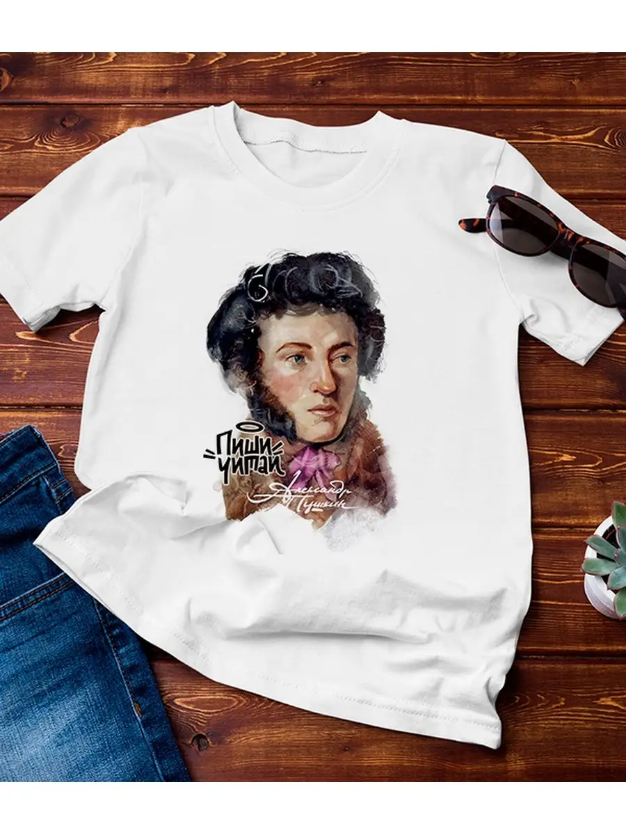 В нашей коллекции представлены футболки с писателями и поэтами, футболка с принтом Владимир Маяковский, Александр Сергеевич Пушкин, Лев Толстой и многие другие. Отличное решение для подарка себе и близким. Ткань плотная, приятная к телу,хлопок 100% Крой футболки-свободный,модный,легкий оверсайз-очень модно и стильно. Футболку такого кроя можно носить с любой одеждой-джинсами,юбкой,костюмом.Оригинальный принт выделит Вас среди других девушек. Отличный подарок на день учителя, новый год, 8 марта или просто без повода любимому учителю.