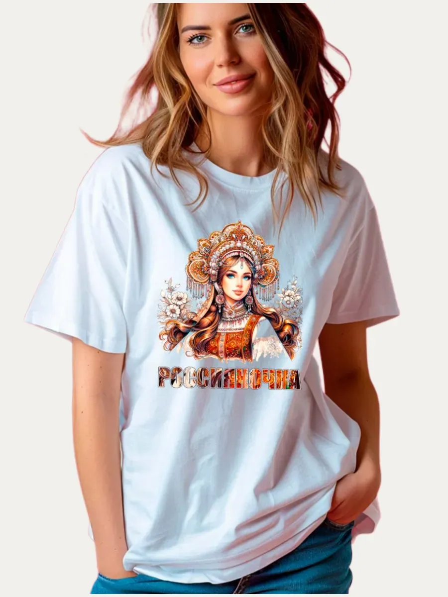 Футболка с матрешкой от бренда «Просто Марка» — это стильный и оригинальный подарок для любой девушки. Изготовленная из 100% хлопка, она подарит вам комфорт и приятные тактильные ощущения. Яркий дизайн с изображением рыжей матрешки, украшенной символикой России, станет настоящим акцентом вашего образа. Эта футболка отлично подойдет для вечеринок, встреч с друзьями или просто для прогулок по городу. Благодаря универсальному дизайну, она прекрасно впишется в любой гардероб и станет любимой вещью на каждый день.