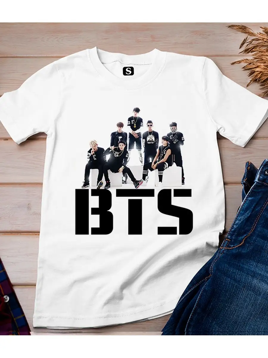 Женская футболка прямого кроя с принтом BTS.Отличное решение для подарка себе и близким.Ткань футболки-100% Хлопок, что гарантируетВам комфортное использование на протяжении долгого времени.Мягкий натуральный хлопок гипоаллергенен, не раздражает кожу и позволяет ей дышать.Супер легкая, приятная телу ткань легко гладится.